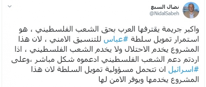 وكتب عبر تغريدة له على "تويتر" رصدها " المشهد العربي": "وأكبر جريمة يقترفها العرب بحق الشعب الفلسطيني، هو استمرار تمويل سلطة عباس للتنسيق الأمني، لأن هذا المشروع يخدم الاحتلال ولا يخدم الشعب الفلسطيني، إذا أردتم دعم الشعب الفلسطيني ادعموه شكل مباشر، وعلى إسرائيل أن تتحمل مسؤولية تمويل السلطة لأن هذا المشروع يخدمها ويوفر الأمن لها".
