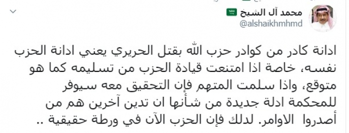 وكتب عبر تغريدة له على "تويتر" رصدها " المشهد العربي": "إدانة كادر من كوادر حزب الله بقتل الحريري يعني إدانة الحزب نفسه، خاصة إذا امتنعت قيادة الحزب من تسليمه كما هو متوقع، وإذا سلمت المتهم فإن التحقيق معه سيوفر للمحكمة ادلة جديدة من شأنها أن تدين آخرين هم من أصدروا الأوامر، لذلك فإن الحزب الآن في ورطة حقيقية".