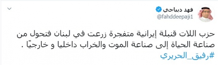 وكتب عبر تغريدة له على "تويتر" رصدها " المشهد العربي":"حزب اللات قنبلة إيرانية متفجرة زرعت في لبنان فتحول من صناعة الحياة إلى صناعة الموت والخراب داخليا و خارجيًا" .
