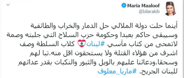 وكتبت عبر تغريدة لها على "تويتر" رصدها " المشهد العربي":"أينما حلت دولة الملالي حل الدمار والخراب والطائفية وسيبقى حاكم بعبدا وحكومة حزب السلاح التي جلبته وصمة لا تمحى من كتاب مآسي لبنان،...السلطة وصف أشرف من هؤلاء القتلة ولا يستحقون أقل منه، تبا لهم وسحقا ودعائنا عليهم بالويل والثبور والنكبات بقدر عدائهم للبنان الجريح".