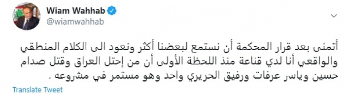 وقال في تغريدة عبر "تويتر" رصدها "المشهد العربي": "أتمنى بعد قرار المحكمة أن نستمع لبعضنا أكثر ونعود الى الكلام المنطقي والواقعي أنا لدي قناعة منذ اللحظة الأولى أن من إحتل العراق وقتل صدام حسين وياسر عرفات ورفيق الحريري واحد وهو مستمر في مشروعه".ذ