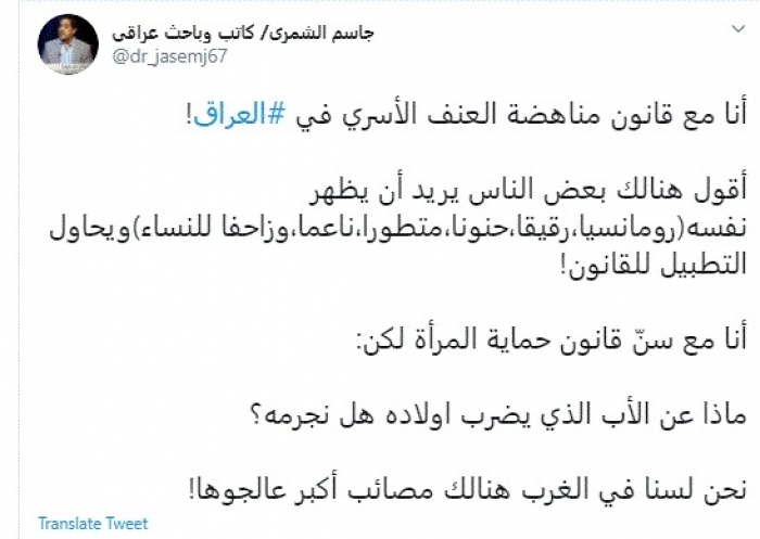 وقال في تغريدة عبر "تويتر" رصدها "المشهد العربي": "أنا مع قانون مناهضة العنف الأسري في العراق! أقول هنالك بعض الناس يريد أن يظهر نفسه (رومانسيا،رقيقا،حنونا،متطورا،ناعما) ويحاول التطبيل للقانون".