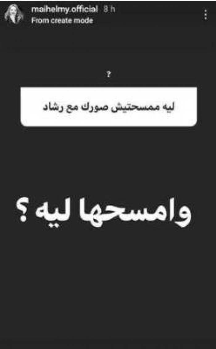 ردت المذيعة مي حلمي، عبر خاصية الاستوري بحسابها الرسمي بموقع إنستجرام، على سؤال وجهه أحد متابعيها قائلا: "ليه ما مسحتيش صورك مع رشاد".