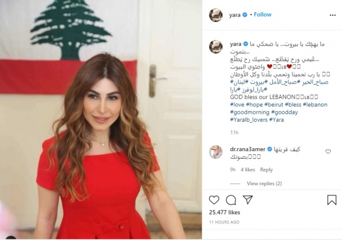 وظهرت يارا في الصورة وخلفها العلم اللبناني، وعلقت: "ما يهمك يا بيروت، يا ضحكة ما بتموت، غيمي ورح تقطع، شمك رح تطلع، واضوي البيوت".