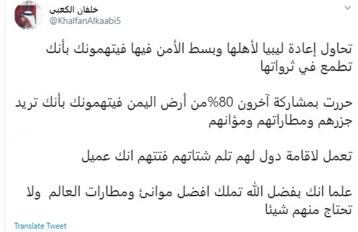 وقال في تغريدة عبر "تويتر" رصدها "المشهد العربي": "تحاول إعادة ليبيا لأهلها وبسط الأمن فيها فيتهمونك بأنك تطمع في ثرواتها".