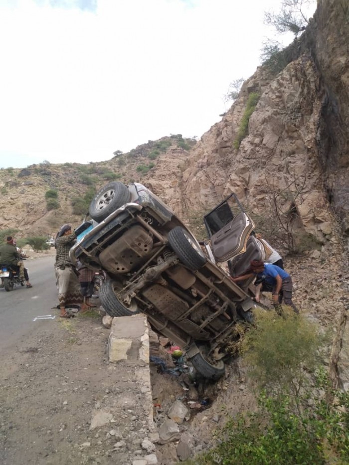 ووقع الحادث المروري لأسرة مواطن من يافع يدعى عبدالرقيب صالح، على خط السير الواقع أسفل نقيل الربوة، بعدما اصطدمت السيارة التي كانت تقلهم بجبل وانقلبت بهم.
