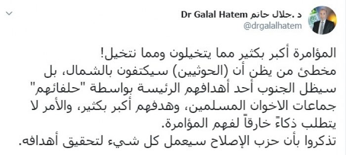جلال حاتم يحذر من مؤامرة إخوانية حوثية ضد الجنوب