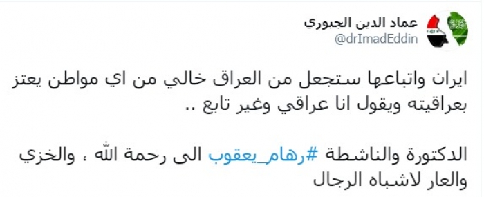 وكتب عبر تغريدة له على "تويتر" رصدها " المشهد العربي":"إيران وأتباعها ستجعل من العراق خالي من أي مواطن يعتز بعراقيته ويقول أنا عراقي وغير تابع، الدكتورة والناشطة رهام يعقوب الى رحمة الله، والخزي والعار لأشباه الرجال" .