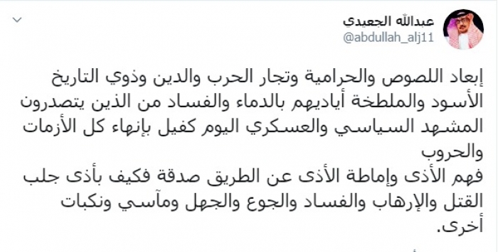 وكتب عبر تغريدة له على "تويتر" رصدها " المشهد العربي": "إبعاد اللصوص والحرامية وتجار الحرب والدين وذوي التاريخ الأسود والملطخة أياديهم بالدماء والفساد من الذين يتصدرون المشهد السياسي والعسكري اليوم كفيل بإنهاء كل الأزمات والحروب، فهم الأذى وإماطة الأذى عن الطريق صدقة فكيف بأذى جلب القتل والإرهاب والفساد والجوع والجهل ومآسي ونكبات أخرى".