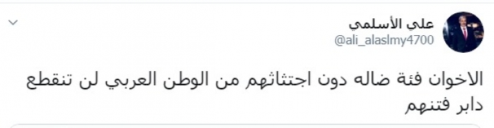 طالب الناشط السياسي علي الأسلمي، اليوم الأربعاء، باجتثاث الإخوان من الوطن العربي.
