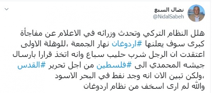 وكتب عبر تغريدة له على "تويتر" رصدها " المشهد العربي": "هلل النظام التركي وتحدث وزرائه في الإعلام عن مفاجأة كبرى سوف يعلنها أردوغان نهار الجمعة، للوهلة الأولى اعتقدت أن الرجل شرب حليب سباع وأنه اتخذ قرارا بإرسال جيشه المحمدي إلى فلسطين من أجل تحرير القدس، ولكن تبين الآن أنه وجد نفط في البحر الأسود، والله لم أرى اسخف من نظام أردوغان".