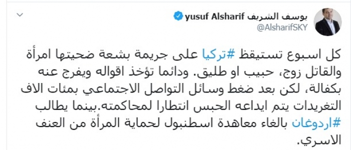 وكتب عبر تغريدة له على "تويتر" رصدها " المشهد العربي": "كل أسبوع تستيقظ تركيا على جريمة بشعة ضحيتها امرأة والقاتل زوج، حبيب أو طليق، ودائما تؤخذ أقواله ويفرج عنه بكفالة، لكن بعد ضغط وسائل التواصل الاجتماعي بمئات آلاف التغريدات يتم إيداعه الحبس انتطارا لمحاكمته، بينما يطالب أردوغان بإلغاء معاهدة إسطنبول لحماية المرأة من العنف الاسري.