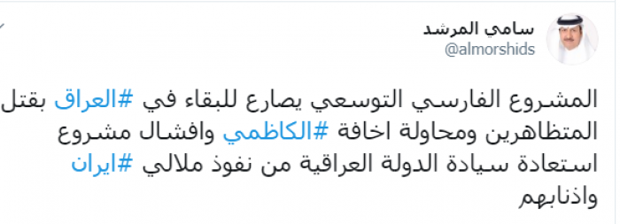 وكتب عبر تغريدة له على "تويتر" رصدها " المشهد العربي": "المشروع الفارسي التوسعي يصارع للبقاء في العراق بقتل المتظاهرين ومحاولة إخافة الكاظمي وإفشال مشروع استعادة سيادة الدولة العراقية من نفوذ ملالي إيران وأذنابهم".