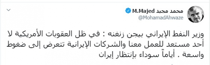 وكتب عبر تغريدة له على "تويتر" رصدها " المشهد العربي": "وزير النفط الإيراني بيجن زنغنه ، في ظل العقوبات الأمريكية لا أحد مستعد للعمل معنا والشركات الإيرانية تتعرض إلى ضغوط واسعة".