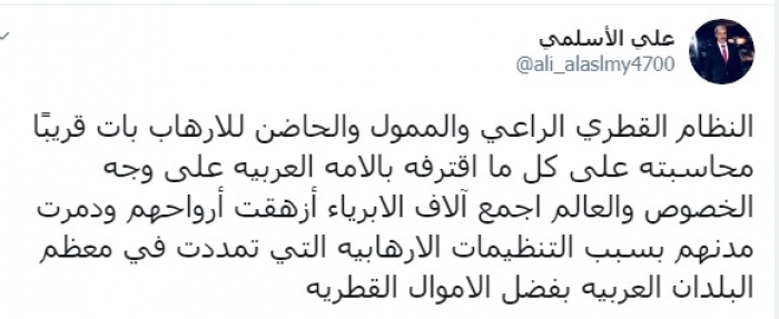 وكتب عبر تغريدة له على "تويتر" رصدها " المشهد العربي": "النظام القطري الراعي والممول والحاضن للإرهاب بات قريبًا محاسبته على كل ما اقترفه بالأمة العربية على وجه الخصوص والعالم أجمع، آلاف الأبرياء أزهقت أرواحهم ودمرت مدنهم بسبب التنظيمات الإرهابية التي تمددت في معظم البلدان العربية بفضل الأموال القطرية".