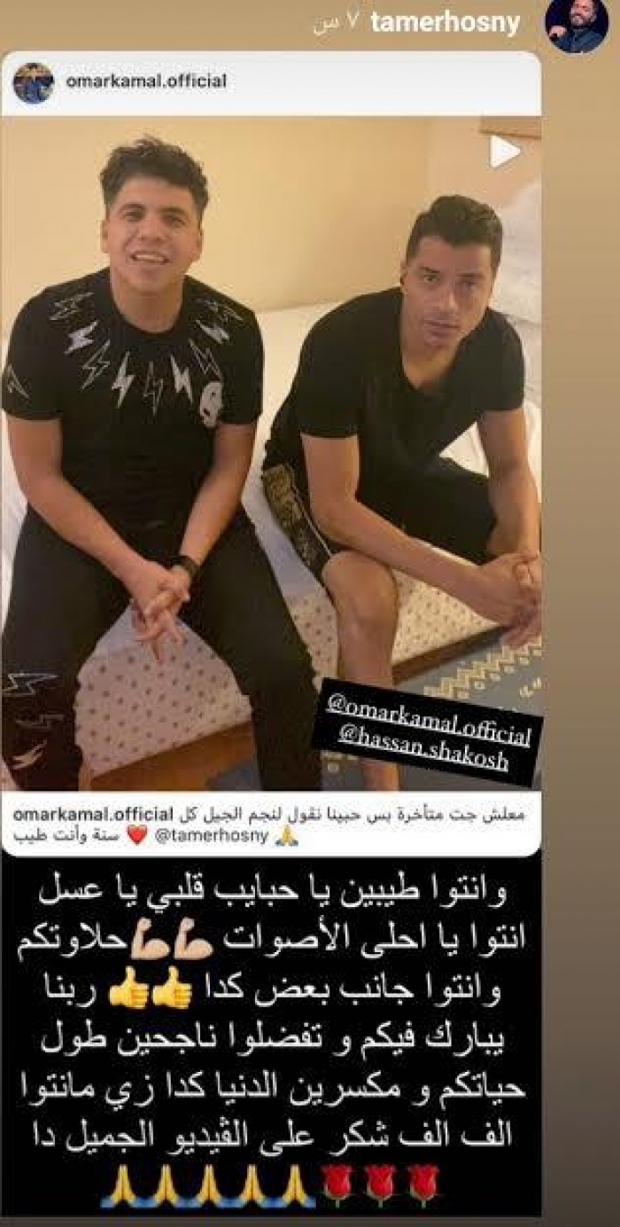 وكتب تامر، عبر ستوري حسابه على "استوري" إنستجرام، قائلا: "وإنتوا طيبين يا حبايب قلبي يا عسل.. إنتوا يا أحلى الأصوات.. حلاوتكم وإنتوا جنب بعض.. ربنا يبارك فيكوا وتفضلوا ناجحين طول حياتكم ومكسرين الدنيا كدا زي ما إنتوا.. ألف ألف شكر على الفيديو الجميل ده".