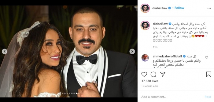 ونشر دياب مجموعة صور تجمعهما، علق عليها: "كل سنة وكل لحظة وإنتِ أحلى حاجة في حياتي، كل سنة وإنتِ معايا وحواليا وفي كل حاجة في حياتي".