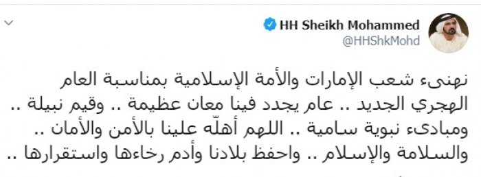 وكتب عبر تغريدة له على "تويتر" رصدها " المشهد العربي": "نهنىء شعب الإمارات والأمة الإسلامية بمناسبة العام الهجري الجديد، عام يجدد فينا معان عظيمة، وقيم نبيلة، ومبادىء نبوية سامية، اللهم أهلّه علينا بالأمن والأمان، والسلامة والإسلام، واحفظ بلادنا وأدم رخاءها واستقرارها".