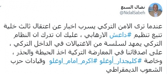 وكتب عبر تغريدة له على "تويتر" رصدها " المشهد العربي":"عندما ترى الأمن التركي يسرب أخبار عن اعتقال ثالث خلية تتبع تنظيم داعش الإرهابي، عليك أن تدرك أن النظام التركي يمهد لسلسلة من الاغتيالات في الداخل التركي، على أصدقائنا في المعارضة التركية أخذ الحيطة والحذر، وخاصة كليجدار أوغلو وأكرم إمام أوغلو وقيادات حزب الشعوب الديمقراطي".