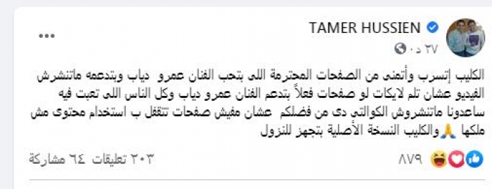 ناشد الشاعر تامر حسين محبي وجمهور الفنان عمرو دياب، تجاهل النسخة المسربة من كليب أحدث أغانيه "أماكن السهر"، مطالبا إياهم بعدم الترويج للنسخة المتداولة.