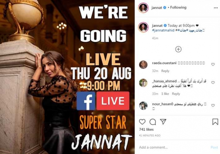 كشفت جنات أنها ستطل على جمهورها لايف من خلال صفحتها على موقع "فيس بوك".