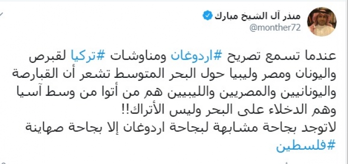 وكتب عبر تغريدة له على "تويتر" رصدها " المشهد العربي": "عندما تسمع تصريح أردوغان ومناوشات تركيا لقبرص واليونان ومصر وليبيا حول البحر المتوسط تشعر أن القبارصة واليونانيين والمصريين والليبيين هم من أتوا من وسط آسيا وهم الدخلاء على البحر وليس الأتراك، لا توجد بجاحة مشابهة لبجاحة أردوغان إلا بجاحة صهاينة فلسطين".