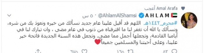 وكتبت الفنانة الإماراتية أحلام، عبر حسابها بموقع تويتر قائلة: "محرم 1442 اللهم قد أقبل علينا عام جديد نسألك من خيره ونعوذ بك من شره، ونسألك يا الله أن تغفر لنا ما اقترفناه من ذنوب في عام مضى، وأن تبارك لنا في أيامنا القادمة، وتجعلها أجمل مما مضى، وتجعل هذه السنة الجديدة فاتحة خير علينا، وعلى أحبتنا والمسلمين جميعاً".