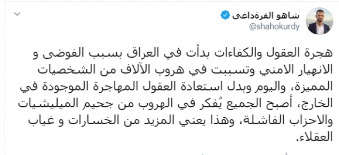 وكتب عبر تغريدة له على "تويتر" رصدها " المشهد العربي": "هجرة العقول والكفاءات بدأت في العراق بسبب الفوضى و الانهيار الأمني وتسببت في هروب الآلاف من الشخصيات المميزة، واليوم وبدل استعادة العقول المهاجرة الموجودة في الخارج، أصبح الجميع يُفكر في الهروب من جحيم المليشيات والأحزاب الفاشلة، وهذا يعني المزيد من الخسارات و غياب العقلاء".