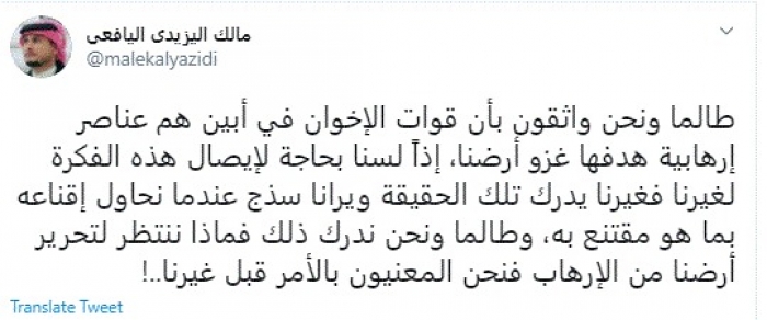 وقال في تغريدة عبر "تويتر" رصدها "المشهد العربي": "طالما ونحن واثقون بأن قوات الإخوان في أبين هم عناصر إرهابية هدفها غزو أرضنا، إذًا لسنا بحاجة لإيصال هذه الفكرة لغيرنا فغيرنا يدرك تلك الحقيقة ويرانا سذج عندما نحاول إقناعه بما هو مقتنع به".