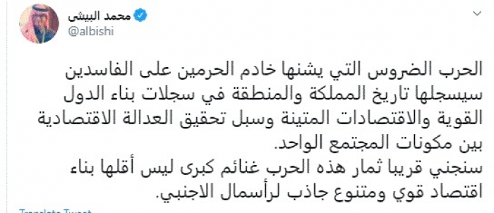 وقال في تغريدة عبر "تويتر" رصدها "المشهد العربي": "الحرب الضروس التي يشنها خادم الحرمين على الفاسدين سيسجلها تاريخ المملكة والمنطقة في سجلات بناء الدول القوية والاقتصادات المتينة وسبل تحقيق العدالة الاقتصادية بين مكونات المجتمع الواحد".