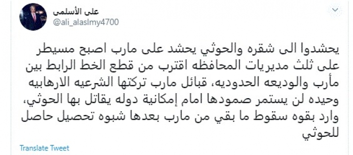 وكتب في تغريدة عبر "تويتر" رصدها "المشهد العربي": "يحشدوا إلى شقرة والحوثي يحشد على مأرب أصبح مسيطر على ثلث مديريات المحافظة اقترب من قطع الخط الرابط بين مأرب والوديعة الحدودية".