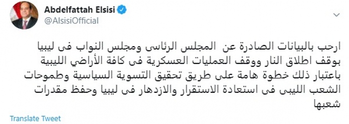 وقال في تغريدة عبر "تويتر" رصدها "المشهد العربي": "أرحب بالبيانات الصادرة عن المجلس الرئاسى ومجلس النواب فى ليبيا بوقف إطلاق النار ووقف العمليات العسكرية فى كافة الأراضي الليبية باعتبار ذلك خطوة هامة على طريق تحقيق التسوية السياسية وطموحات الشعب الليبى فى استعادة الاستقرار والازدهار فى ليبيا وحفظ مقدرات شعبها".