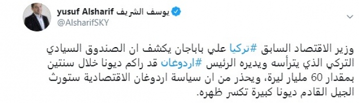 وقال في تغريدة عبر "تويتر" رصدها "المشهد العربي": "وزير الاقتصاد السابق تركيا علي باباجان يكشف ان الصندوق السيادي التركي الذي يترأسه ويديره الرئيس أردوغان قد راكم ديونا خلال سنتين بمقدار 60 مليار ليرة، ويحذر من أن سياسة أردوغان الاقتصادية ستورث الجيل القادم ديونا كبيرة تكسر ظهره".