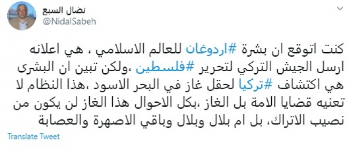 وقال في تغريدة عبر "تويتر" رصدها "المشهد العربي": "كنت أتوقع أن بشرى أردوغان للعالم الإسلامي، هي إعلانه إرسال الجيش التركي لتحرير فلسطين، ولكن تبين أن البشرى هي اكتشاف تركيا لحقل غاز في البحر الأسود".
