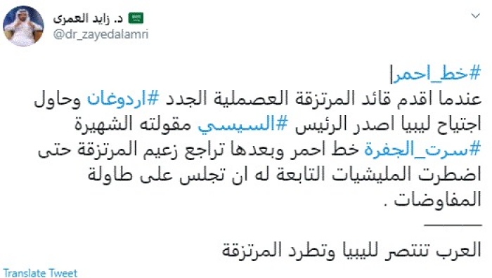 وقال في تغريدة عبر "تويتر" رصدها "المشهد العربي": "خط أحمر| عندما أقدم قائد المرتزقة العصملية الجدد أردوغان وحاول اجتياح ليبيا اصدر الرئيس السيسي مقولته الشهيرة سرت الجفرة خط أحمر وبعدها تراجع زعيم المرتزقة حتى اضطرت المليشيات التابعة له ان تجلس على طاولة المفاوضات. العرب تنتصر لليبيا وتطرد المرتزقة".
