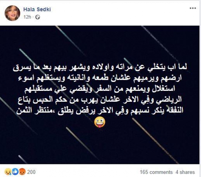 هالة كانت كتبت أيضًا "لما أب يتخلى عن مراته وأولاده ويشهر بيهم بعد ما يسرق أرضهم، ويرميهم علشان طمعه وأنانيته ويستغلهم أسوء استغلال ويمنعهم من السفر ويقضي علي مستقبلهم الرياضي، وفي الآخر علشان يهرب من حكم الحبس بتاع النفقة ينكر نسبهم وفي الآخر يرفض يطلق، منتظر الثمن".