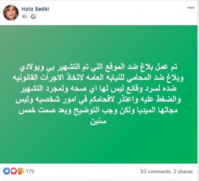 هالة علقت على الأمر عبر حسابها الشخصي على موقع "فيسبوك"، بأكثر من منشور، كان آخرها ما كتبته عن تحريرها لمحضر ضد الموقع الذي قام بالتشهير بها وبأولادها، ومحضر آخر ضد المحامي في النيابة العامة.