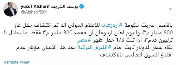 وقال في تغريدة عبر "تويتر" رصدها "المشهد العربي": "بالأمس سربت حكومة أردوغان للإعلام الدولي أنه تم اكتشاف حقل غاز 800 مليار م٣، واليوم أعلن اردوغان أن حجمه 320 مليار م٣ فقط، ما يعادل ١١ ترليون قدم٣، أي ثلث 1/3 حقل ظهر مصر".