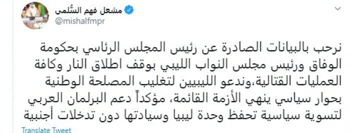 رحب رئيس البرلمان العربي مشعل السلمي، اليوم، بالبيانات الصادرة عن الأطراف الليبية بوقف إطلاق النار في ليبيا، داعيًا الليبين لتغليب المصلحة الوطنية وإنهاء الأزمة عبر حوار سياسي.