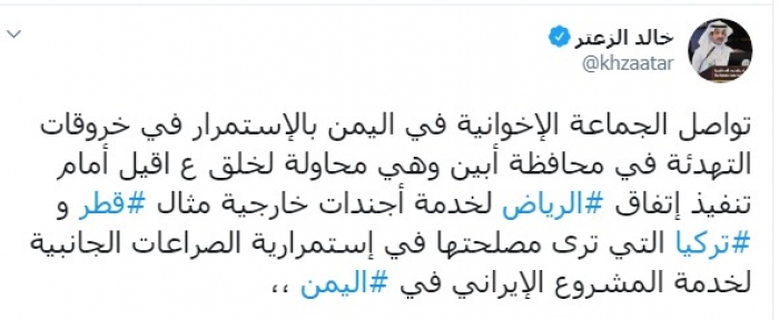 وكتب عبر تغريدة له على "تويتر" رصدها "المشهد العربي": "تواصل الجماعة الإخوانية في اليمن بالاستمرار في خروقات التهدئة في محافظة أبين وهي محاولة لخلق عراقيل أمام تنفيذ اتفاق الرياض لخدمة أجندات خارجية مثال قطر وتركيا التي ترى مصلحتها في استمرارية الصراعات الجانبية لخدمة المشروع الإيراني في اليمن".