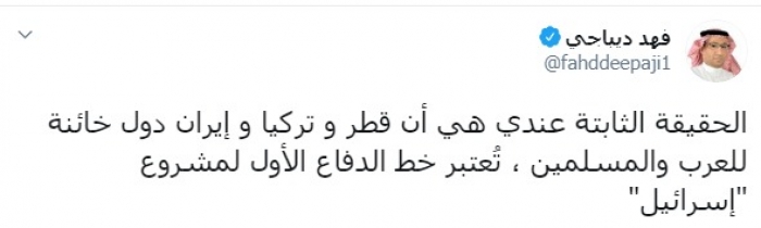 وكتب عبر تغريدة له على "تويتر" رصدها " المشهد العربي": "الحقيقة الثابتة عندي هي أن قطر و تركيا و إيران دول خائنة للعرب والمسلمين ، تُعتبر خط الدفاع الأول لمشروع إسرائيل".