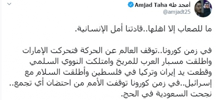 وكتب عبر تغريدة له على "تويتر" رصدها " المشهد العربي": "ما للصعاب إلا أهلها، قادتنا أمل الإنسانية، في زمن كورونا، توقف العالم عن الحركة فتحركت الإمارات وأطلقت مسبار العرب للمريخ وامتلكت النووي السلمي وقطعت يد إيران وتركيا في فلسطين، وأطلقت السلام مع إسرائيل، في زمن كورونا توقفت الأمم من احتضان أي تجمع، نجحت السعودية في الحج".