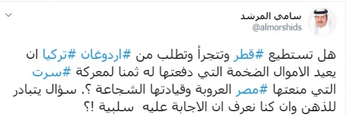 وكتب عبر تغريدة له على "تويتر" رصدها " المشهد العربي": "هل تستطيع قطروتتجرأ وتطلب من أردوغان تركيا أن يعيد الأموال الضخمة التي دفعتها له ثمنا لمعركة سرت التي منعتها مصر العروبة وقيادتها الشجاعة ؟سؤال يتبادر للذهن وإن كنا نعرف أن الإجابة عليه سلبية ".