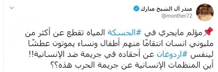 وكتب عبر تغريدة له على "تويتر" رصدها " المشهد العربي": "مؤلم ما يجري في الحسكة، المياه تقطع عن أكثر من مليوني انسان انتقامًا منهم أطفال ونساء يموتون عطشًا لينفس أردوغان عن أحقاده في جريمة ضد الإنسانية، أين المنظمات الإنسانية عن جريمة الحرب هذه".