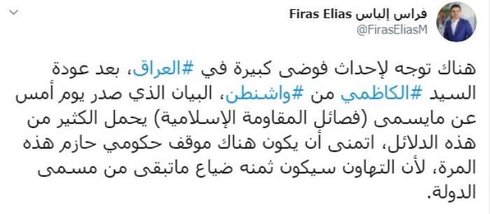 وكتب عبر تغريدة له على "تويتر" رصدها " المشهد العربي": "هناك توجه لإحداث فوضى كبيرة في العراق، بعد عودة السيد الكاظمي من واشنطن، البيان الذي صدر يوم أمس عن ما يسمى (فصائل المقاومة الإسلامية) يحمل الكثير من هذه الدلائل، اتمنى أن يكون هناك موقف حكومي حازم هذه المرة، لأن التهاون سيكون ثمنه ضياع ما تبقى من مسمى الدولة".