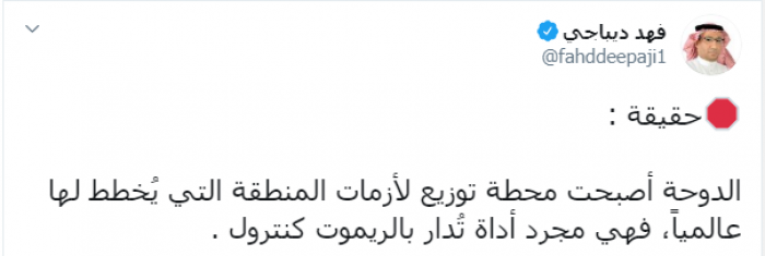 وكتب عبر تغريدة له على "تويتر" رصدها " المشهد العربي":"حقيقة، الدوحة أصبحت محطة توزيع لأزمات المنطقة التي يُخطط لها عالمياً، فهي مجرد أداة تُدار بالريموت كنترول".