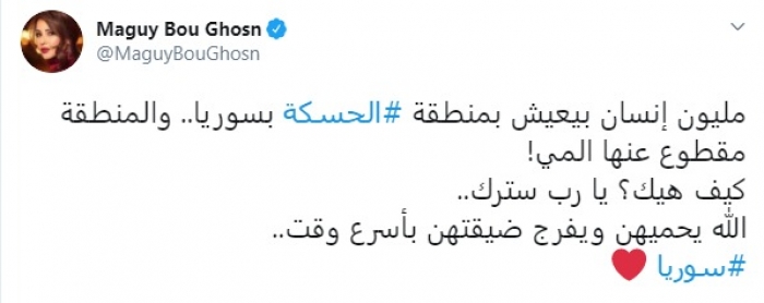 وكتبت ماجي تغريدة، عبر حسابها الرسمي بموقع "تويتر"، :"مليون إنسان بيعيش بمنطقة الحسكة بسوريا، والمنطقة مقطوع عنها المياة، كيف هيك، يارب سترك، الله يحميهن ويفرج ضيقتهن بأسرع وقت".