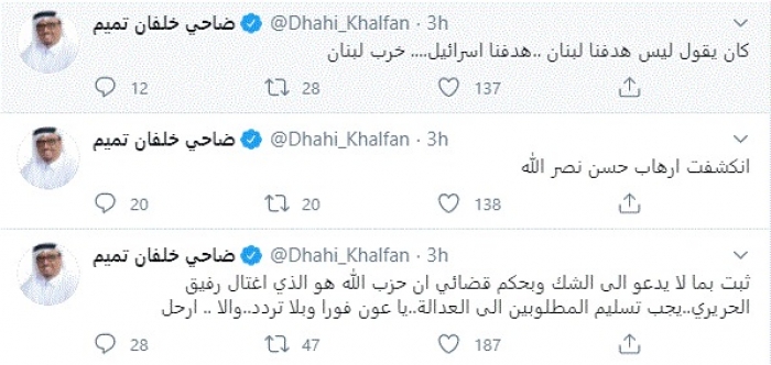 طالب نائب مدير الشرطة والأمن العام في دبي الفريق ضاحي خلفان، اليوم، الرئيس اللبناني ميشال عون بتسليم المتورطين من حزب الله في اغتيال رئيس الوزراء اللبناني الأسبق رفيق الحريري.