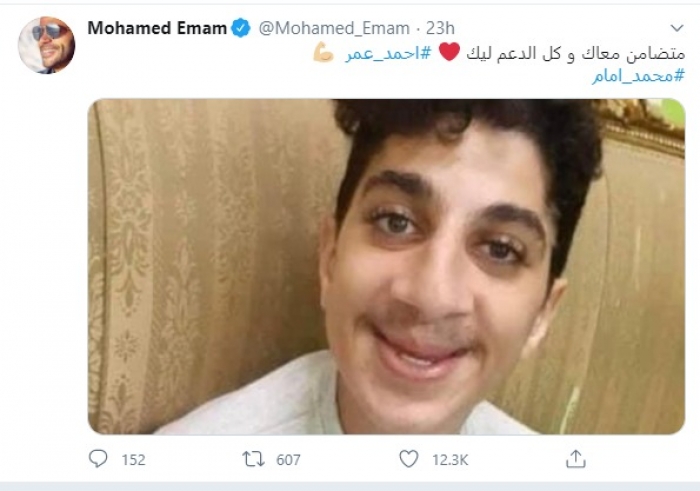 أعلن الفنان محمد إمام، عن تضامنه مع الشاب المصري أحمد عمر، طالب كلية التربية الرياضية الذي تعرض للتنمر.