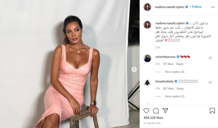 وعلقت نادين على الصور:"ما قبل 4 أغسطس، ما قبل الانفجار، كنت عم صور حلقة لبرنامج على التليفزيون قلت بحط ها الصورة فيها لون زهر بيعطي أمل شوي، لغدا أفضل".